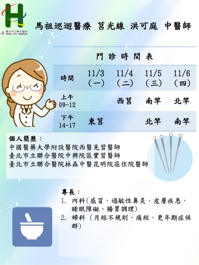 馬祖中醫巡迴醫療114/11/3-11/6由莒光線洪可庭醫師、東引線顏宏璋醫師前往支援服務。
