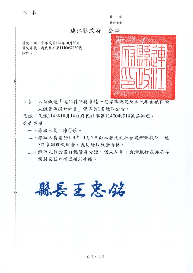 連江縣政府民政社會處-國民年金督導員錄取公告