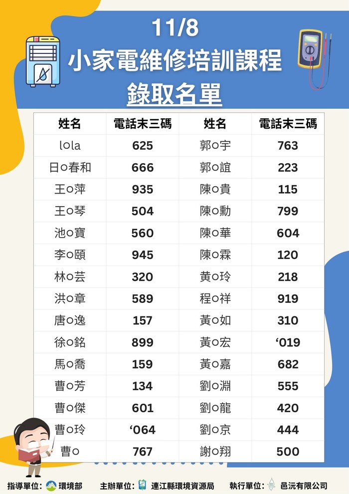 11/8小家電維修培訓課程【錄取公告】 --閱讀人次 : 880 為延續物命、減少資源浪費,並提升馬祖地區家電自主修復的能力,連江縣環境資源局自114年起推動「小家電自己修系列培訓課程」。課程由專業技職團隊授課,透過實際操作與鄉親親手體驗,培養在地「自己修」的維修志工,逐步建構「不用品維修站」量能,實踐修繕共享與愛物惜物的精神。