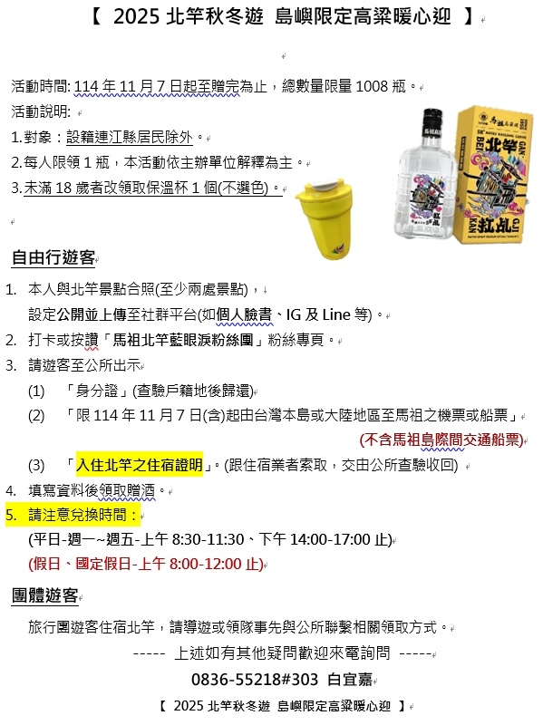 北竿秋冬遊島嶼限定高粱暖心迎!正式開跑 --閱讀人次 : 1247 為推廣秋冬旅遊魅力,北竿鄉公所推出「島嶼限定高粱暖心迎」活動,凡旅客於活動期間來訪,即有機會獲得限量高粱好禮,數量有限,送完為止。