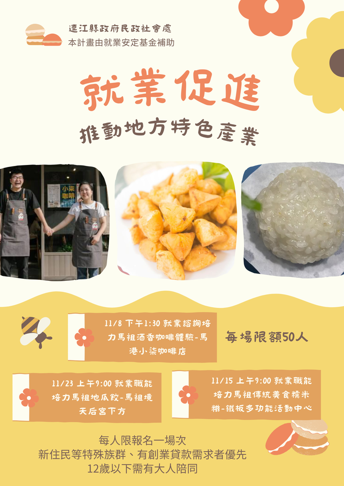 11月23日(星期日)就業職能培力~馬祖地瓜餃/馬港天后宮下方、馬港社協旁:9:00-15:00