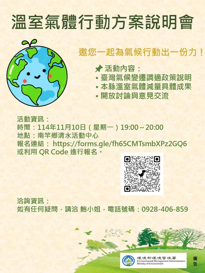 為讓民眾深入瞭解臺灣氣候變遷調適政策及本縣近年減碳成果,連江縣環境資源局於114年11月10日(星期一)19時假清水活動中心辦理「連江縣溫室氣體行動方案」說明會。邀請對氣候變遷議題有興趣的民眾參與,期盼藉由多元意見交流,凝聚共識,強化本縣氣候變遷調適的務實對策。