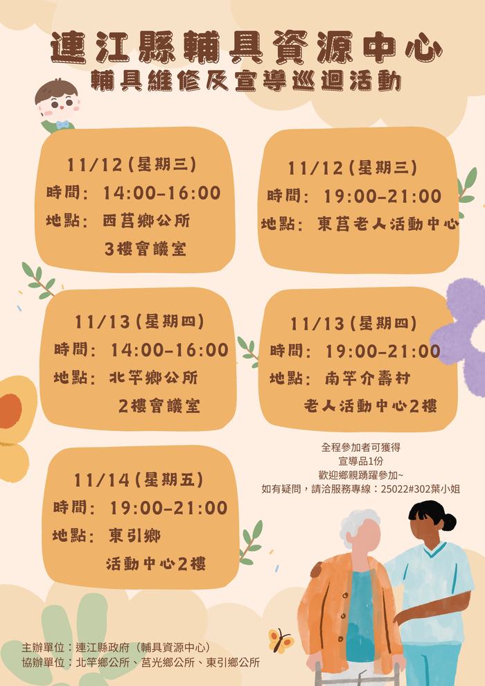 原訂於11月12日至11月14舉辦的「輔具巡迴宣導活動」,因氣候影響導致船班取消,活動無法如期進行,故取消本次活動。