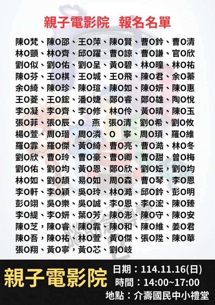 親子電影院活動 報名名單公告 --閱讀人次 : 785 就在本周日!