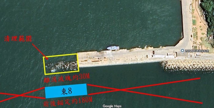 因應青帆碼頭區南防坡堤延長工程施作需求,於南防坡堤堤頭拆除作業(並實施消波塊吊除、卵塊石清理、方塊吊離以及整地等工程)