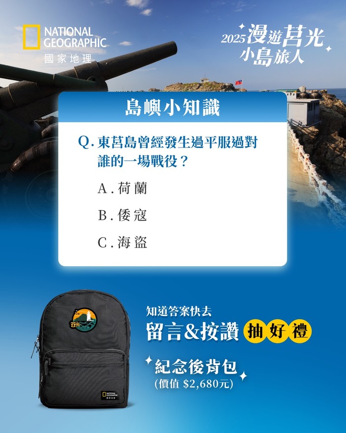 漫遊莒光11/24島嶼小知識得獎名單 --閱讀人次 : 546 由莒光鄉公所與《國家地理》雜誌攜手打造的「2025漫遊莒光 小島旅人」系列活動至 2026年3月10日,邀請大家深度走進馬祖莒光島,透過知識探索與影像創作,國家地理雜誌Facebook社群亦推出「島嶼小知識 Q&A」,以趣味問答方式認識莒光的歷史、文化與自然景觀,只要留言互動即可參與抽獎。