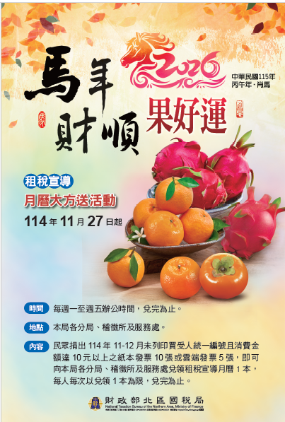 國稅局-11/27發票換月曆 --閱讀人次 : 1014 財政部北區國稅局馬祖服務處表示:為推廣統一發票多元兌獎服務措施及鼓勵馬祖鄉親索取雲端發票,特訂於114年11月27日早上8:30起,辦理捐贈統一發票換精美月曆活動。每年印製的水果月曆深受鄉親喜愛,月曆以各月份台灣當令水果為主題,嚴選的水果照片,飽滿豐盈,吉祥討喜,而且今年特別印製二張–「馬運亨通」及「迎財納福」春聯供鄉親使用。