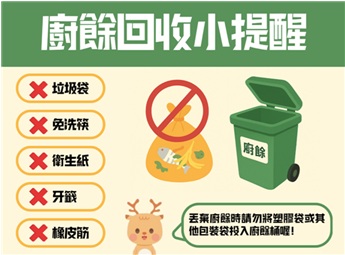透過正確廚餘分類與投放,可讓廚餘順利再利用,用於堆肥或能源化處理,提升資源循環效益。環資局呼籲鄉親共同落實分類,從小動作做起,讓廚餘回收更乾淨、資源利用更有效!