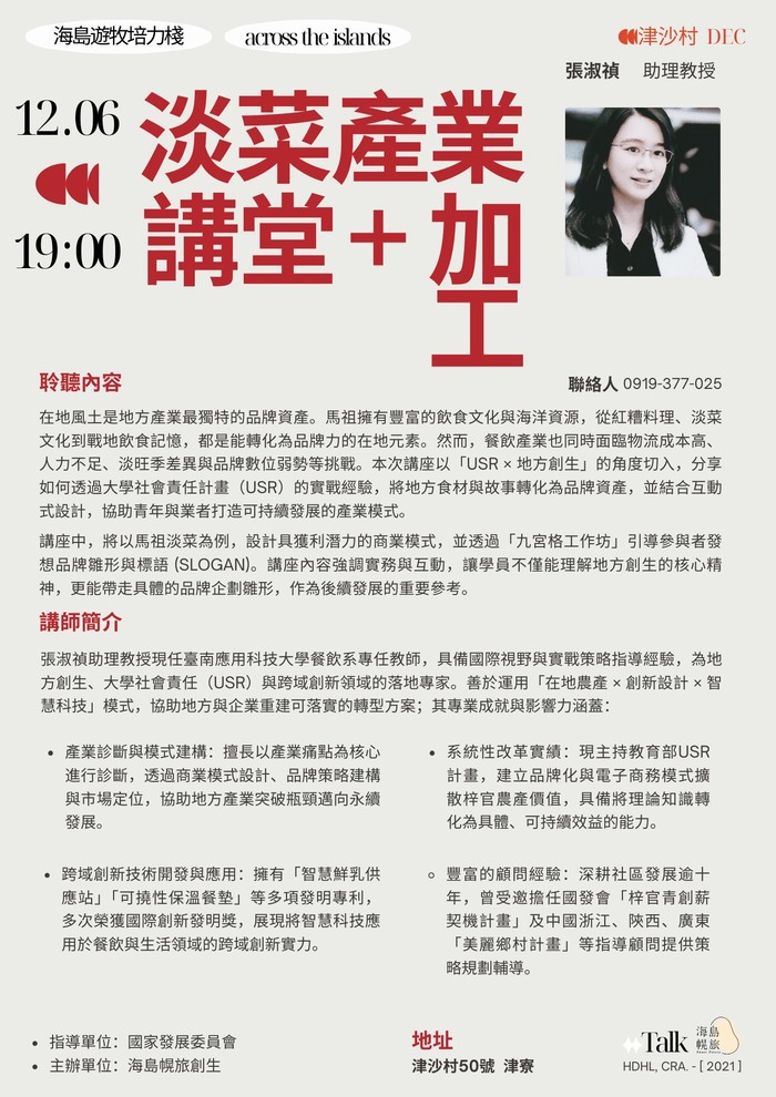 講堂內容:在地風土是地方產業最獨特的品牌資產。馬祖擁有豐富的飲食文化與海洋資源,從紅糟料理、淡菜文化到戰地飲食記憶,都是能轉化為品牌力的在地元素。然而,餐飲產業也同時面臨物流成本高、人力不足、淡旺季差異與品牌數位弱勢等挑戰。