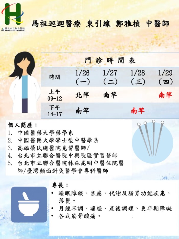 馬祖中醫巡迴醫療1/26–1/29由莒光線蔡和熹醫師、東引線鄭雅楨醫師前往支援服務。