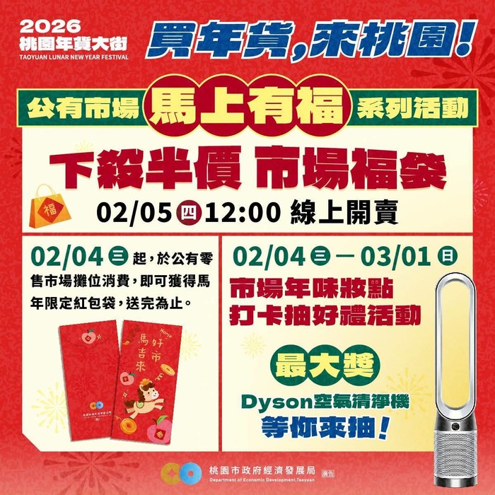 🧧市場年味妝點打卡抽好禮:於02/04(三) 至 03/01(日),到公有市場與年味妝點拍照打卡,最大獎 #Dyson空氣清淨機 等你來抽!