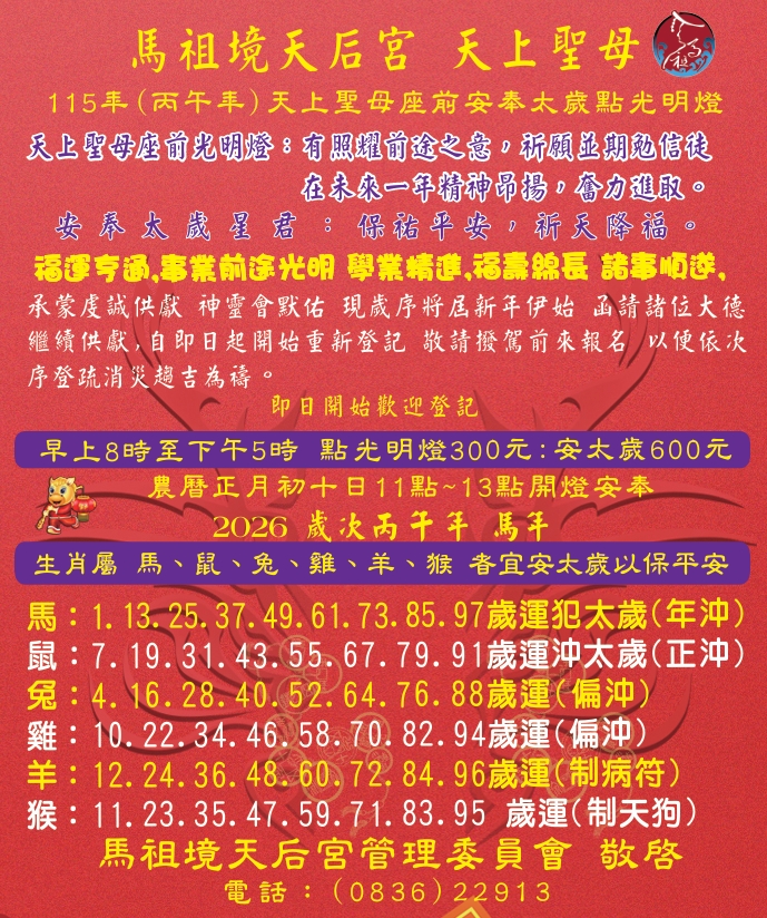 115年(丙午年)天上聖母座前安奉太歲點光明燈