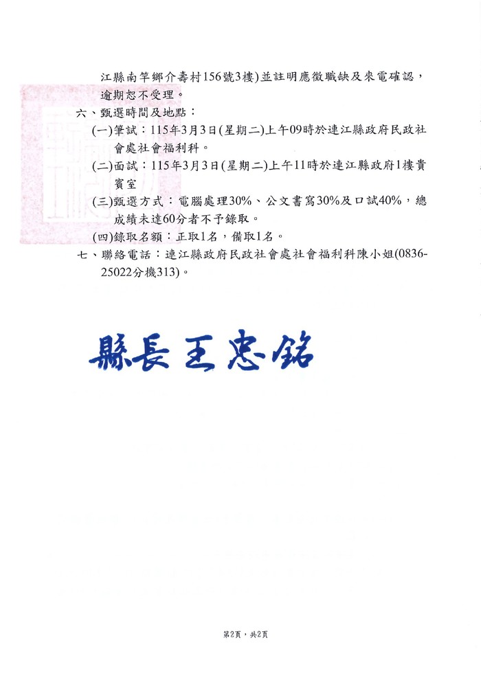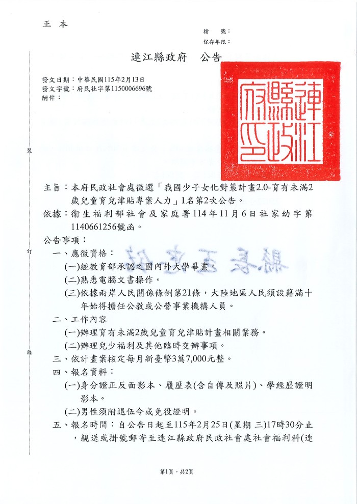 民政社會處育兒津貼專案人力第2次公告