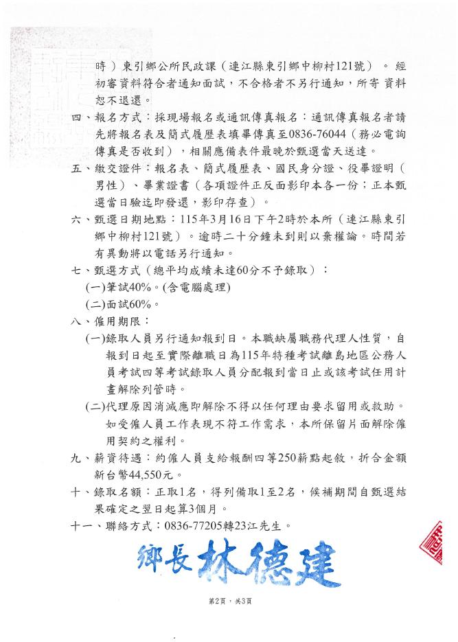 東引鄉公所第二次村幹事約僱職代公告