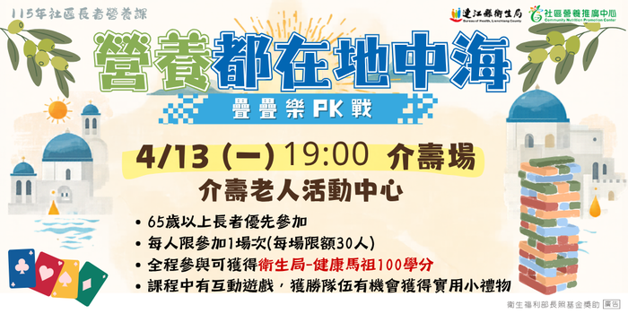 4/13(一)營養都在地中海_介壽場 --閱讀人次 : 356 歡迎65歲以上長輩踴躍參加~
