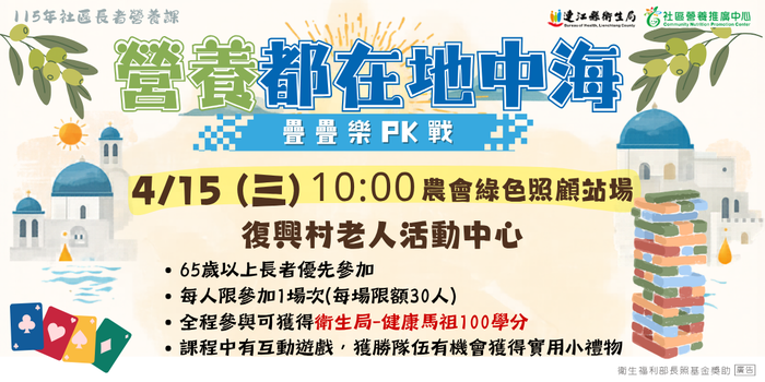 4/15營養都在地中海_農會綠照場 --閱讀人次 : 527 歡迎65歲以上長輩踴躍參加~
