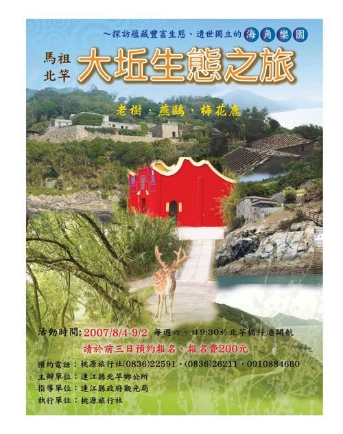北竿鄉公所將於96年8月4日至9月2日每週末(六、日)舉辦大坵生態之旅活動於上午9:30分由橋仔港出發至大坵,隨導覽員登島瀏覽90分鐘,於11:00分由大坵返回。費用200元,請先電話預約報名,報名專線(0836022591、(0836)26211、0910884660。