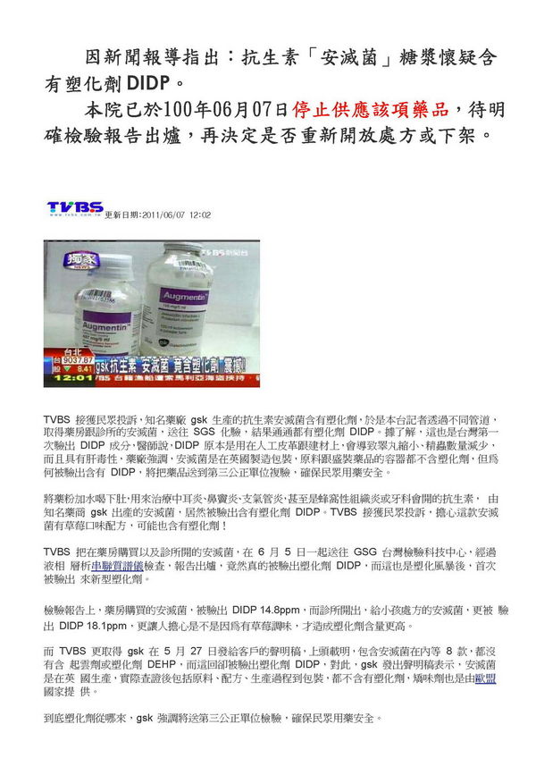 因新聞報導指出:抗生素「安滅菌」糖漿懷疑含有塑化劑 DIDP。