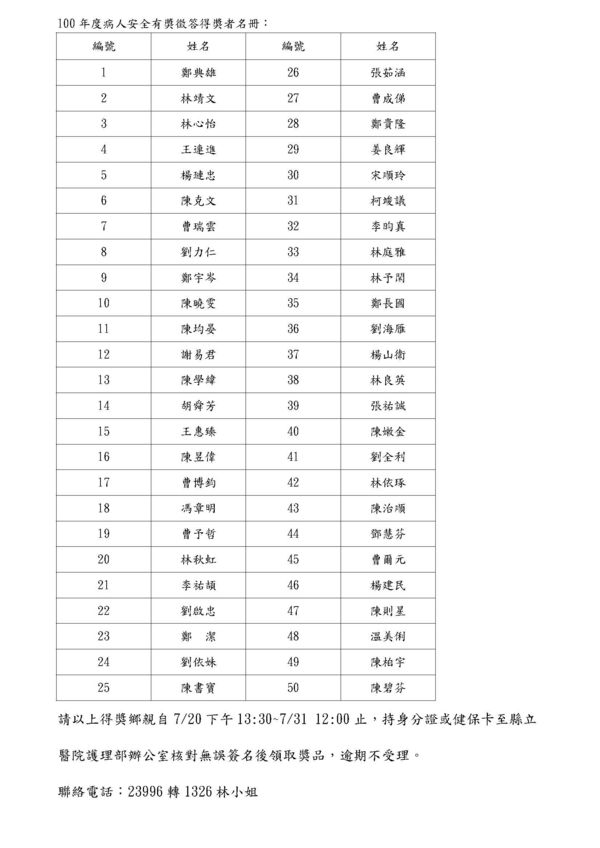 100年縣立醫院病人安全有獎徵答得獎名單
