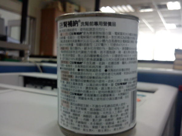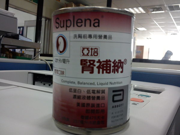 品名:亞培-腎補納(洗腎前專用營養品)亞培-腎補納是為限制蛋白質、電解質和水分攝取的患者而設計的高熱量、低蛋白、低電解質的營養品。適用於慢性腎衰竭、急性腎衰竭、洗腎前的尿毒症患者、肝癌患者。一罐容量237毫升。