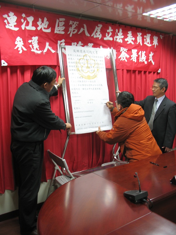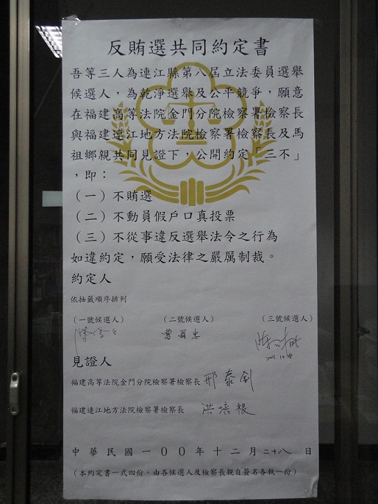 連江地檢署繼日前辦理連江地區萬信齊發反賄選宣導後,於昨(28)日下午,特別邀請第八屆立法委員參選人陳雪生、曹爾忠、陳財能(依抽籤號次順序)等3人在福建連江地方法院檢察署三樓會議室,簽署反賄選「三不」約定書:約定不賄選、不動員假戶口真投票、不從事違反選舉法令之行為。簽署儀式在金門高分檢邢檢察長泰釗、連江地檢署洪檢察長培根、媒體、鄉親之見證及3位立法委員參選人之全力支持下完成。