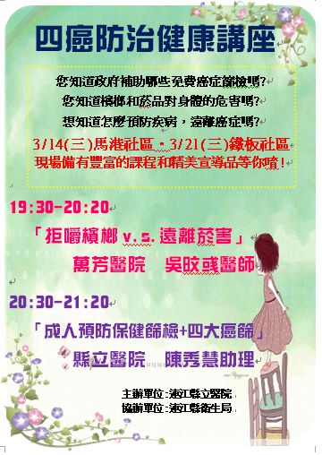 我們將於3月14日在馬港社區發展協會及3月21日在鐵板社區發展協會舉辦「四癌防治健康講座」。