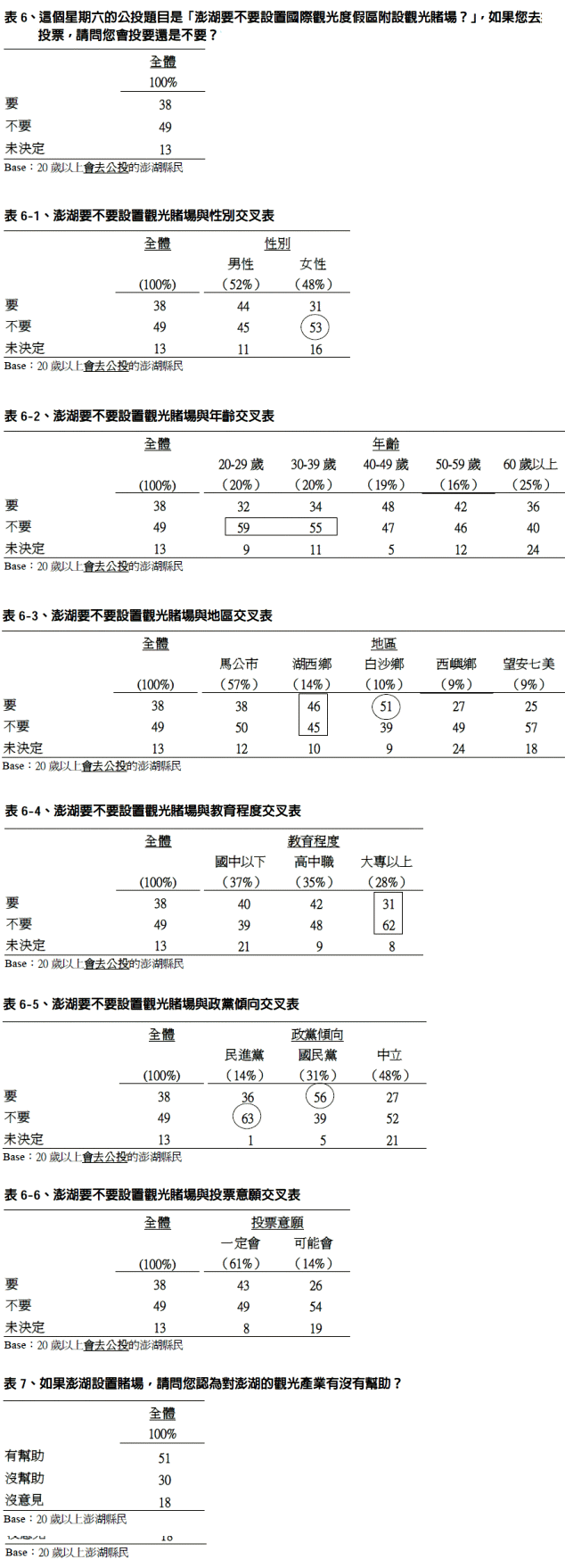 以下是2009年9月TVBS在澎湖所舉行的民調,比對分析表格如下: