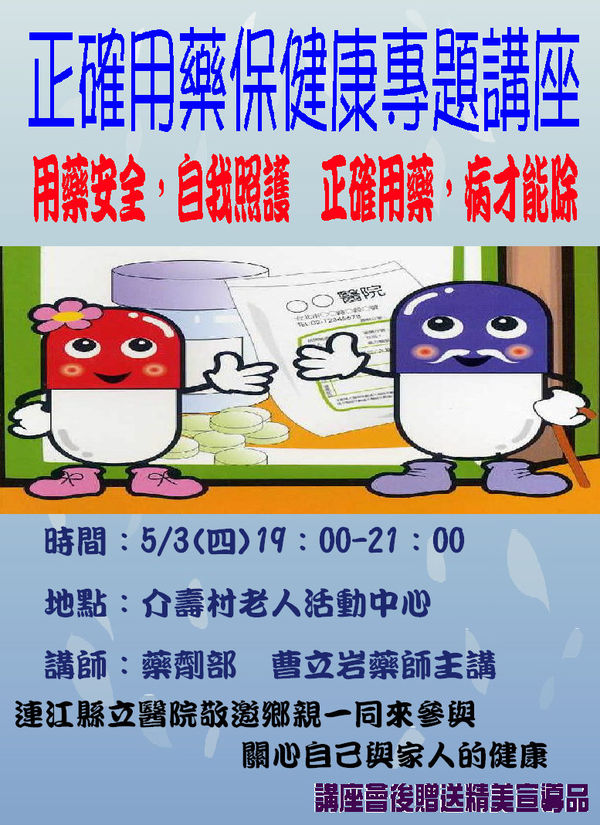 連江縣立醫院於5月3日(四)晚上19:00∼21:00,於介壽老人中心,辦理一場用藥安全宣導,由藥劑部曹立岩藥師主講「正確用藥保健康」講座,歡迎民眾踴躍參加。