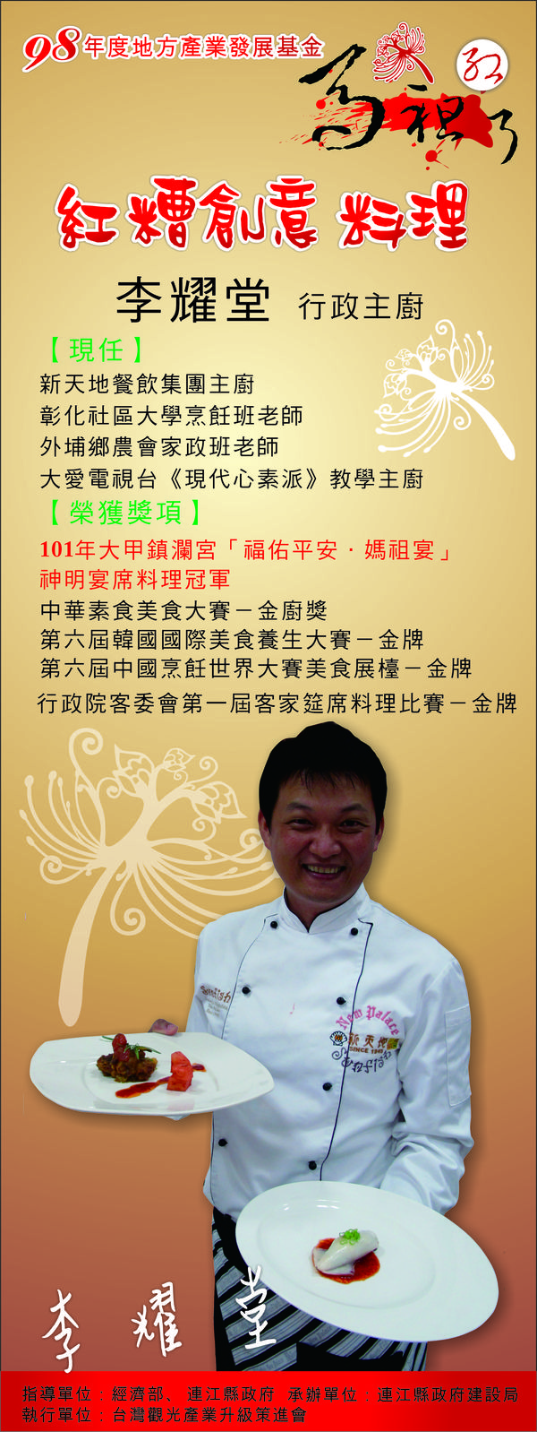 本次「519馬祖招商展」期間除了展示「馬祖紅了,紅糟美食特色產業輔導計畫」三年來的輔導成果外,為促使馬祖紅糟能運用創意手法將在地特色食材變化出各式特色料理,特別邀請新天地行政主廚李耀堂及太鼓餐飲謝一新主廚到現場示範紅糟創意料理製作。本次以馬祖的慈悲護佑之心為主題,推出「紅麴醬佛手」、「果醋紫菜佐紅麴果粒」、「紅麴魚皮捲」、「煙燻紅糟貽貝」四道菜餚。看馬祖的紅糟,在五星級大廚創意發想下,將化身成一道道令人驚艷的美味佳餚與各位見面!