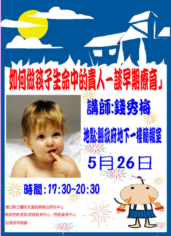 如何做孩子生命中的貴人-談早期療育 時間更正為17:30~20:30 --閱讀人次 : 1251 每位父母最大的願望就是看著自己的心肝寶貝快樂健康的成長,