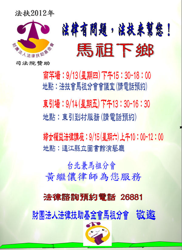 法扶會律師下鄉服務 9/13南竿 9/14東引
