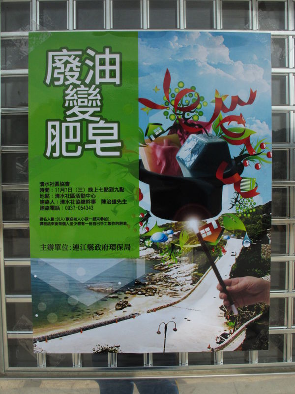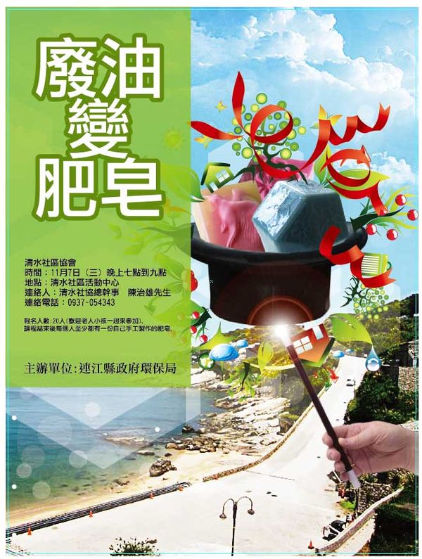 環保局<廢油回收 手工製皂>課程,將於11月7日於南竿清水舉辦,課程免費,歡迎有興趣民眾踴躍參加