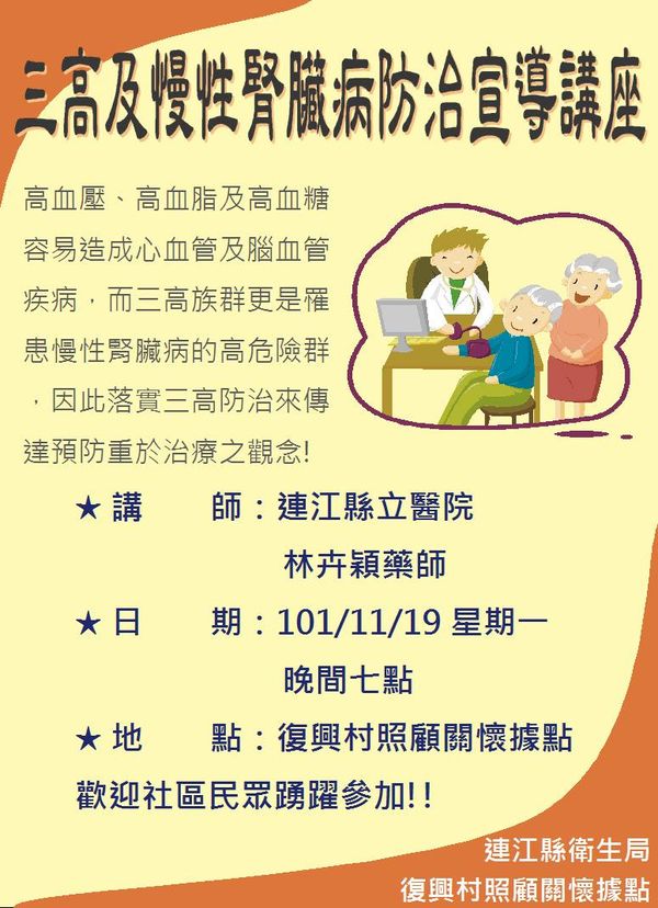 今晚七點三高及慢性腎臟病防治講座