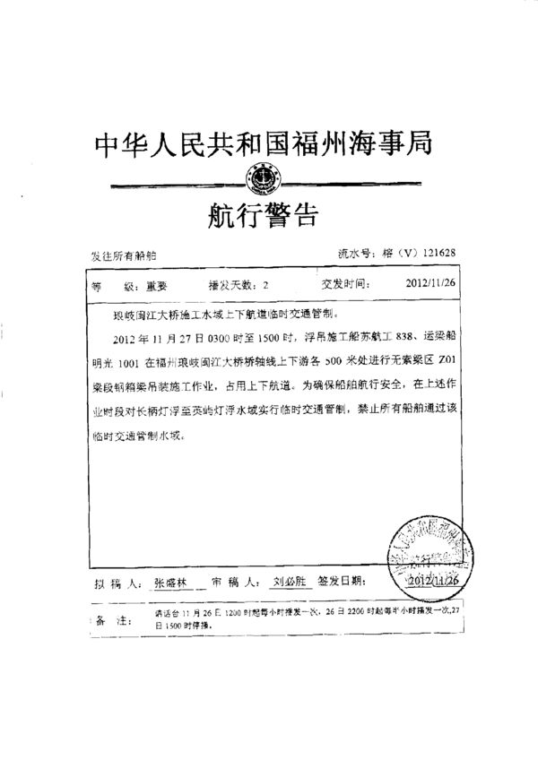 依據中華人民共和國福州海事局航行警告