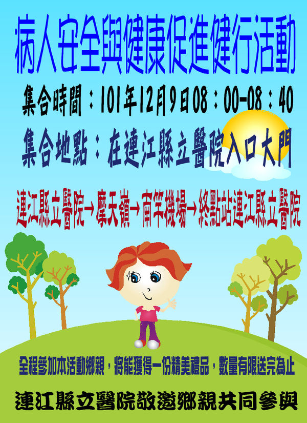 病人安全與健康促進健行活動與您有約! --閱讀人次 : 1244 連江縣立醫院為促進本縣鄉親之間情誼交流,舒展身心,鼓勵走向戶外,接觸大自然進而擁抱健康;特別舉辦健行活動,讓鄉親在活動中體會大自然的美與健康的重要。