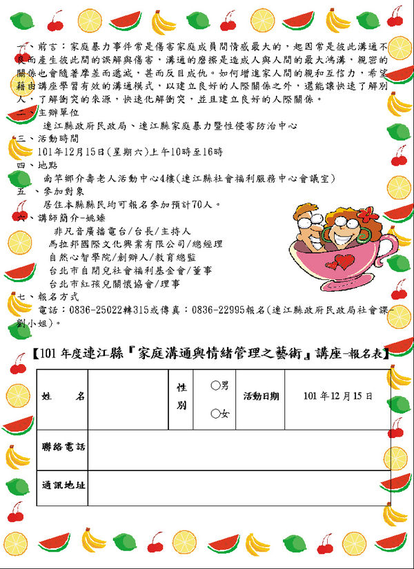 連江縣政府民政局訂於101年12月15日(星期六) 上午10:00~12:00、下午14:00~1600,辦理「家庭溝通技巧與情緒管理之藝術」講座,現正開放報名,名額有限,請民眾踴躍報名參加,凡全程參加者可獲得精美宣導品乙份,謝謝。