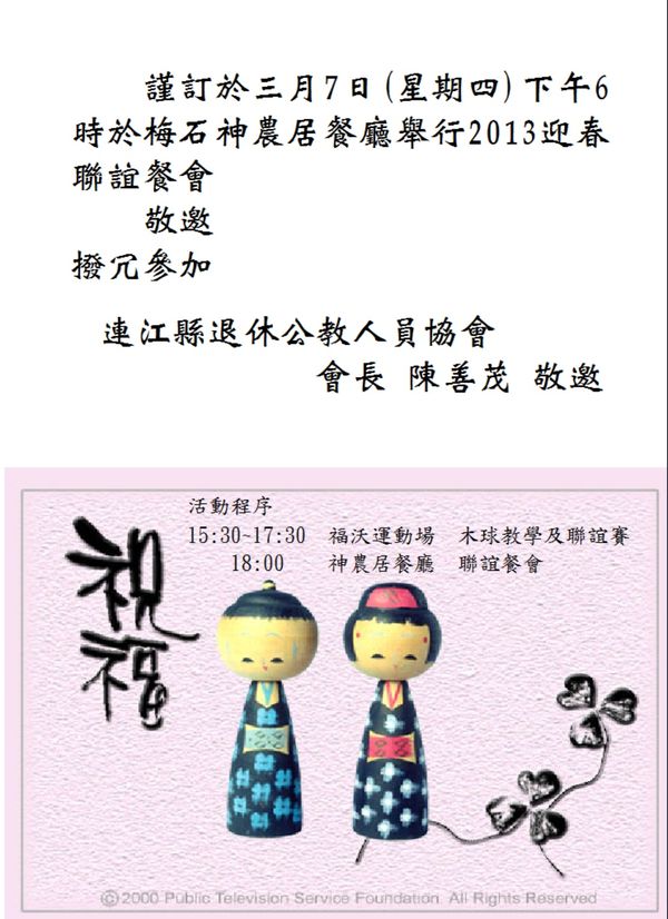 連江縣退休公教人員協會訂於三月7日(星期四)下午舉辦木球聯誼及迎春餐會,邀請會員踴躍參加。