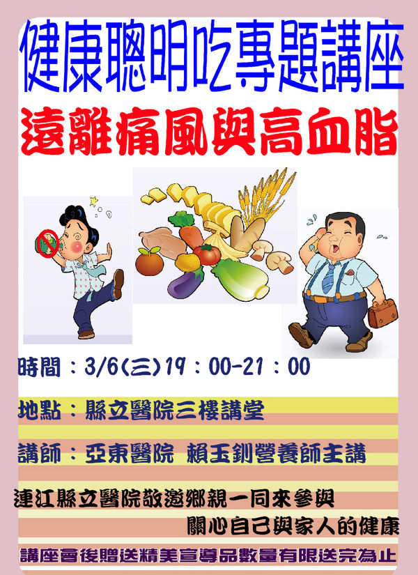 連江縣立醫院健康飲食聰明吃專題講座 --閱讀人次 : 1249 根據行政院衛生署統計資料顯示,45歲以上,每4人中約有1人有高血脂,隨著現代人飲食習慣的改變,痛風及高血脂在台灣等亞洲國家的流行率正逐年增加且有年輕化的趨勢,台灣罹患痛風的患者數高達50多萬人,尿酸過高的人數更高達500多萬人,目前臺灣痛風的高盛行率位居世界首位。 對此, 連江縣立醫院增進鄉親對痛風與高血脂的認識與了解, 邀請營養師以輕鬆、活潑的講座來進一步提升鄉親健康觀念, 並期望增加健康知識, 建立正確的飲食與保養,遠離痛風與高血脂。