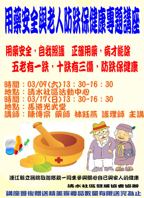 連江縣立醫院於3月9及17日下午13:30∼16:30,於清水村、馬港村,各辦理一場用藥安全及老人防跌宣導,由藥劑部陳傳宗藥師主講「正確用藥保健康」及護理部林鈺燕護理師主講「老人防跌保健康」講座,歡迎民眾踴躍參加。