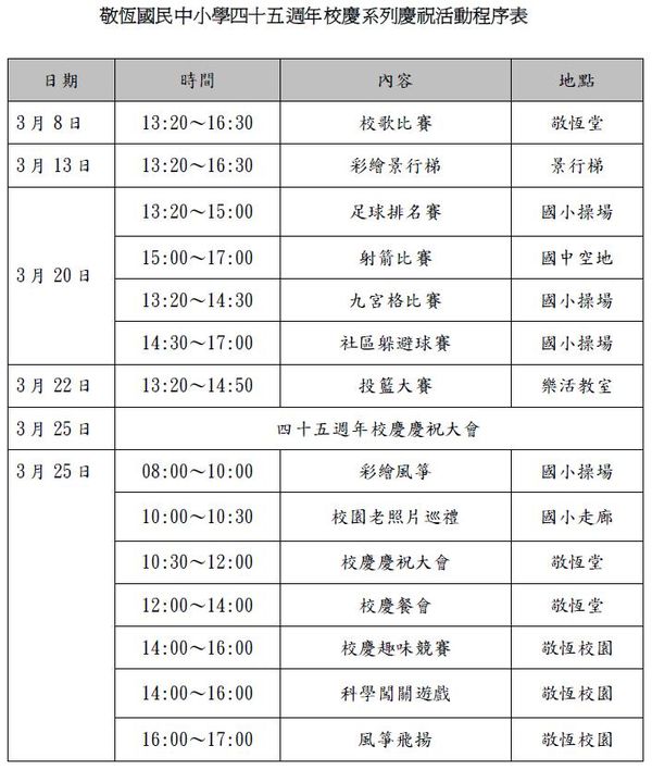 敬恆國民中小學四十五週年校慶系列慶祝活動程序表
