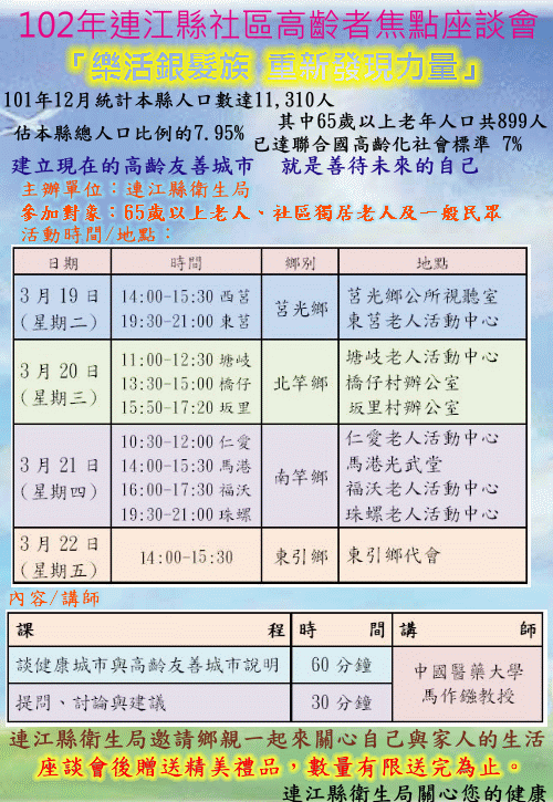 本次活動邀請中國醫藥大學馬作鏹教授蒞馬擔任講師,將於102年3月19日至22日巡迴四鄉五島,進入社區推廣高齡友善,邀請65歲以上長者及關心未來自己的鄉親共同參與。