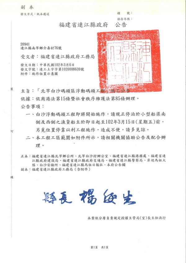 北竿白沙浮動碼頭工程施工-請配合移泊