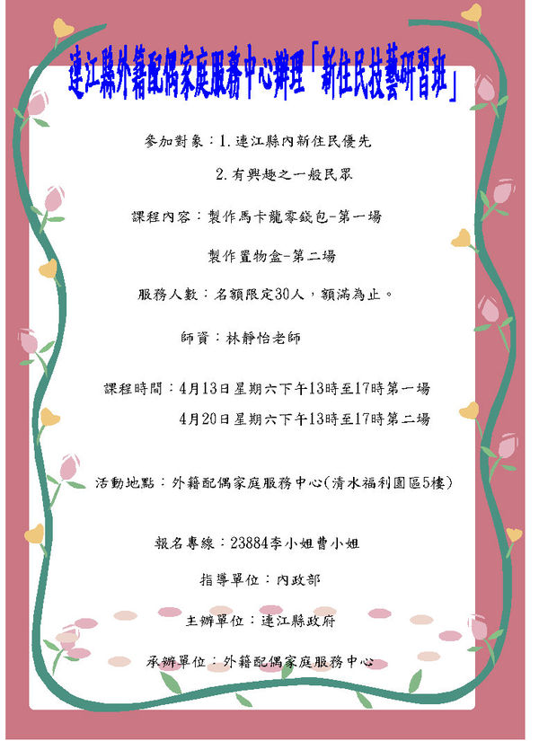 外配中心辦理新住民技藝研習~歡迎報名