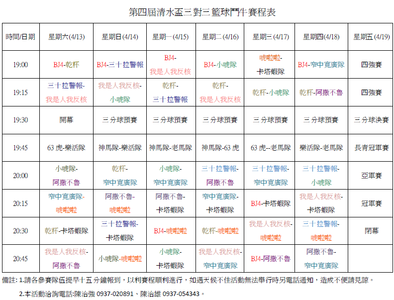 第四屆清水盃三對三籃球鬥牛賽程表 --閱讀人次 : 1294 第四屆清水盃三對三籃球鬥牛賽程表