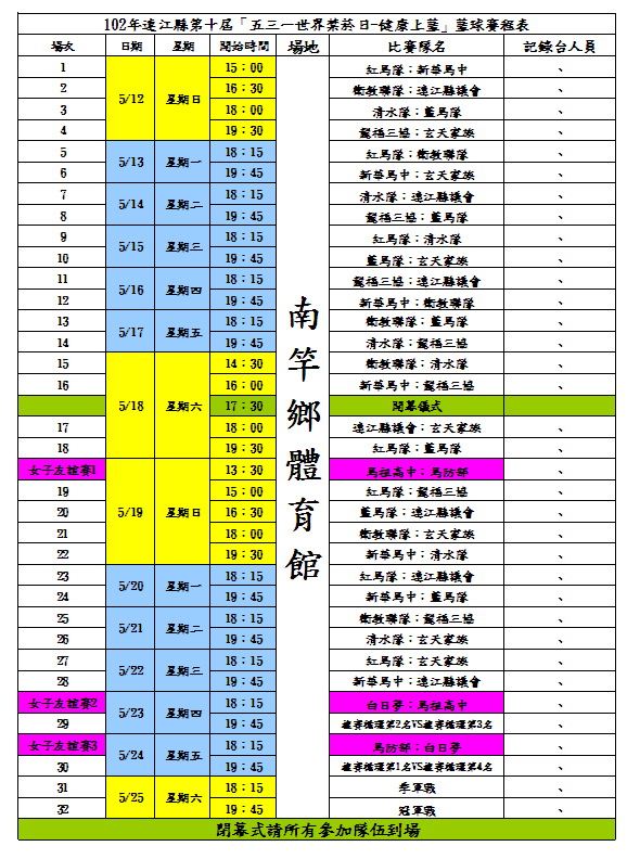 附加Excel文件表: matsu-3ecc885a18c5592a74ae327bf7c64676.xls102健康上籃賽程時間表