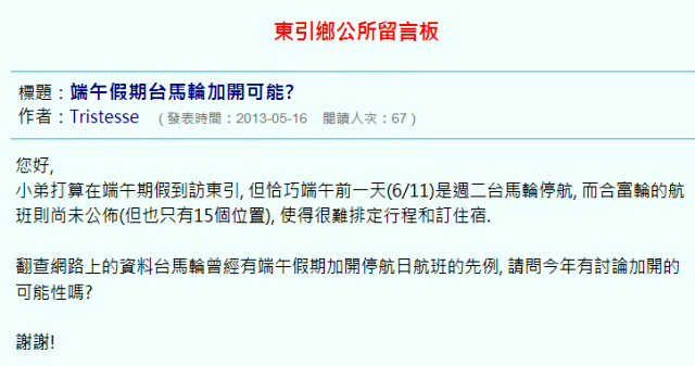 以上是東引鄉公所留言板的一篇文章,事情雖小,但由於時間充裕,交通局可以考慮調整臺馬輪航班,或增加合富輪的交換船票,因應旅客需求。
