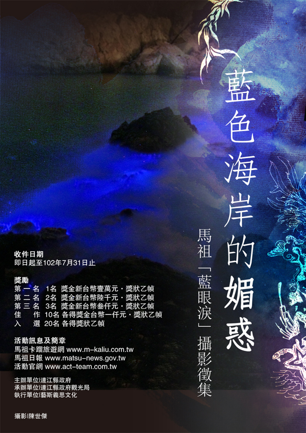 馬祖日報【記者曹重偉�南竿報導】您有藍眼淚的好作品嗎?快來參加「藍色海岸的媚惑-馬祖『藍眼淚』攝影徵集活動」!縣府觀光局表示,希望透過攝影作品徵集,廣邀攝影愛好者以馬祖「藍眼淚」(夜光藻)為主題,透過攝影鏡頭捕捉馬祖獨特的「藍眼淚」自然生態景觀,將馬祖的美向外傳遞、發散,第一名可獲獎金1萬元,即日起受理收件至102年7月31日止(郵寄以郵戳為憑),歡迎攝影好手們踴躍參加。