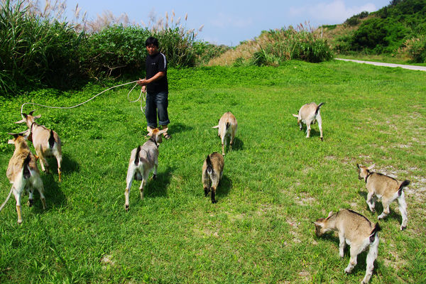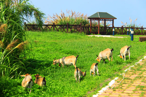 山羊在村內草地吃草