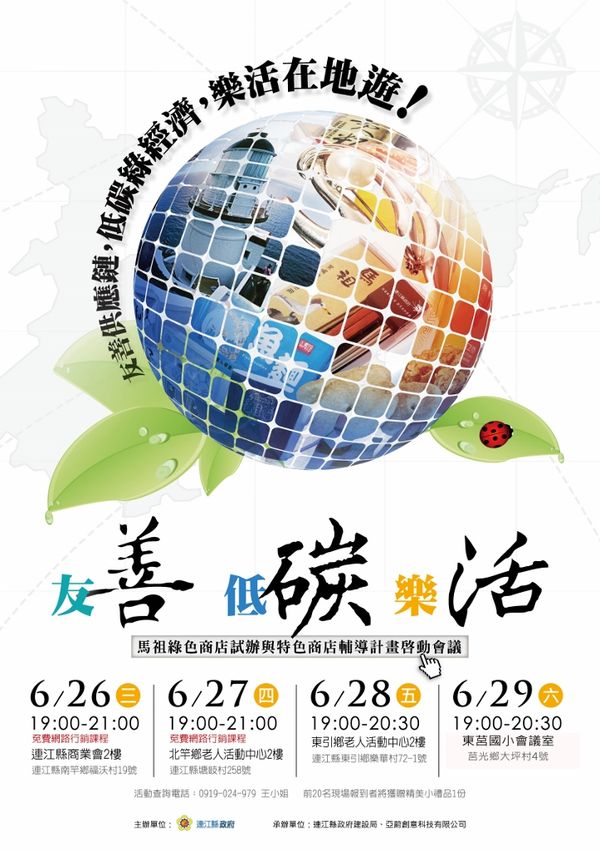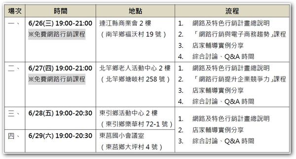 今日(6/26)啟動會議場地在南竿商業會2樓(南竿鄉福沃村19號),時間為晚上七點到九點鐘,現場並有免費的網路行銷課程,特別請來台灣知名網站-大台灣旅遊網的花總監現場教學,機會難得,說明會現場並提供諮詢服務,前20名現場報到者,將獲贈精美小禮品1份,請大家踴躍參加。