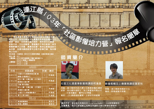 社區影像培力營活動 歡迎鄉親報名參加 --閱讀人次 : 1406 為社區紀錄,留下你我的生活!社區營造中心舉辦「連江縣103年社區影像培力營」活動,讓熱愛社區事務的朋友們能夠更熟練運用手邊的攝錄器材,並邀請到國立雲林科技大學文化資產維護系柯鴻基老師與本縣教育網路中心葉家裕老師,為學員講解有關社區文化資產攝影與後製應用的實作課程,時間為8月3日及4日上午共一天半,上課地點在復興村五靈公廟活動中心,歡迎大家踴躍報名。